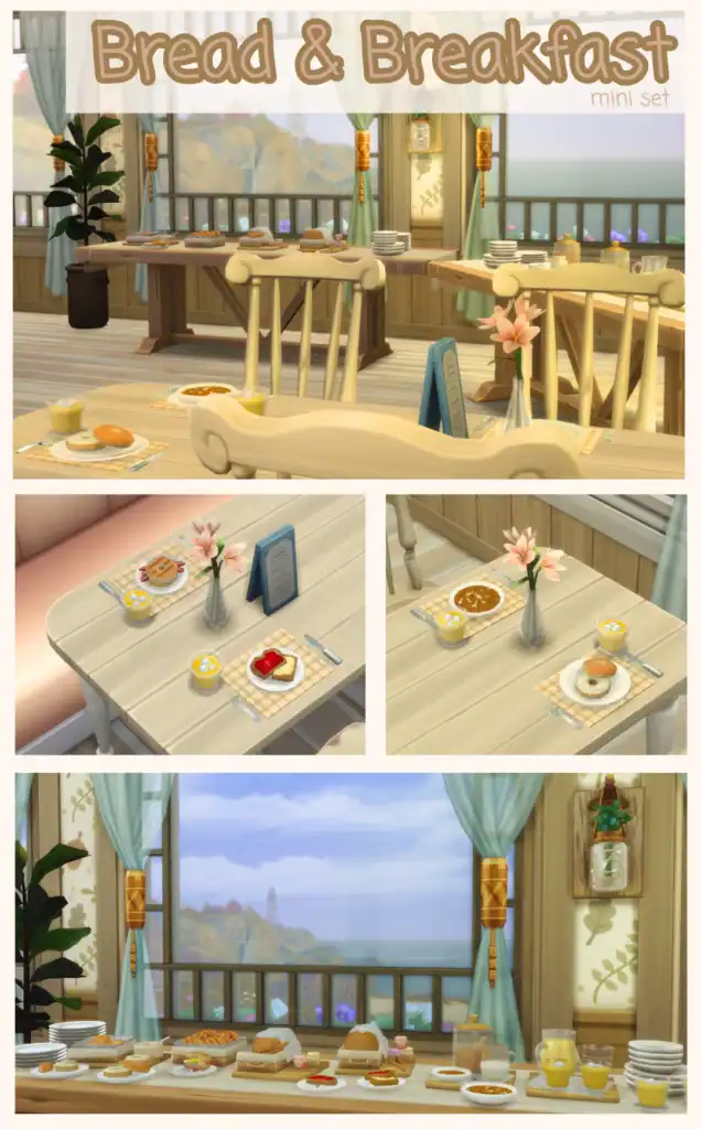 This is base game compatible, and is designed to integrate smoothly with kitchen clutter and breakfast-related CC.