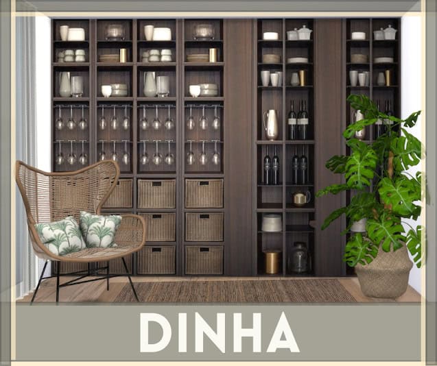 The Dinha Kitchen Panel is a built-in storage unit designed to bring structure and realism to your kitchen and dining spaces. It features tall paneling with open shelving, glass storage, and woven drawer sections.