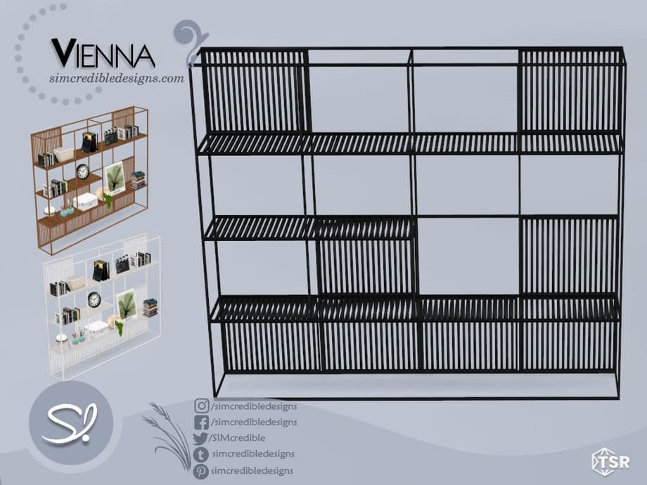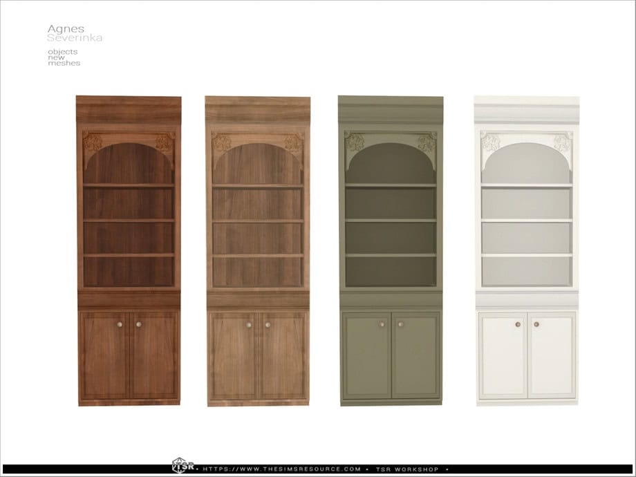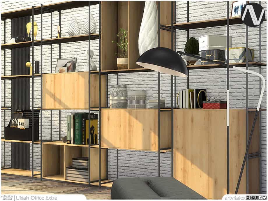 The Sims 4 cc set contains multiple shelf variations with metal framing, wood panels, and optional cabinet storage. Use these to organize books, décor, office supplies, and decorative objects in a structured way.