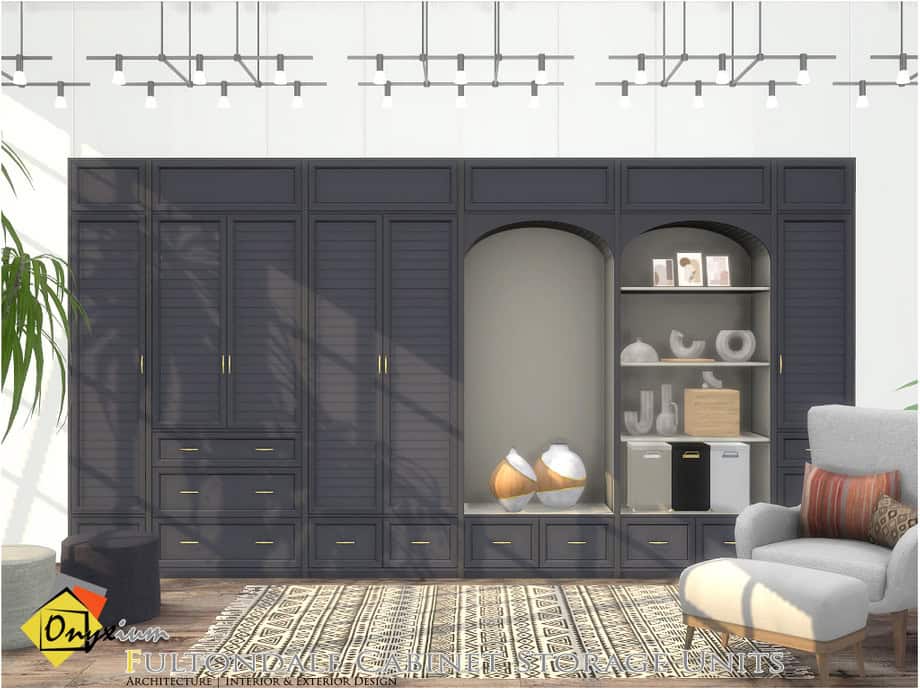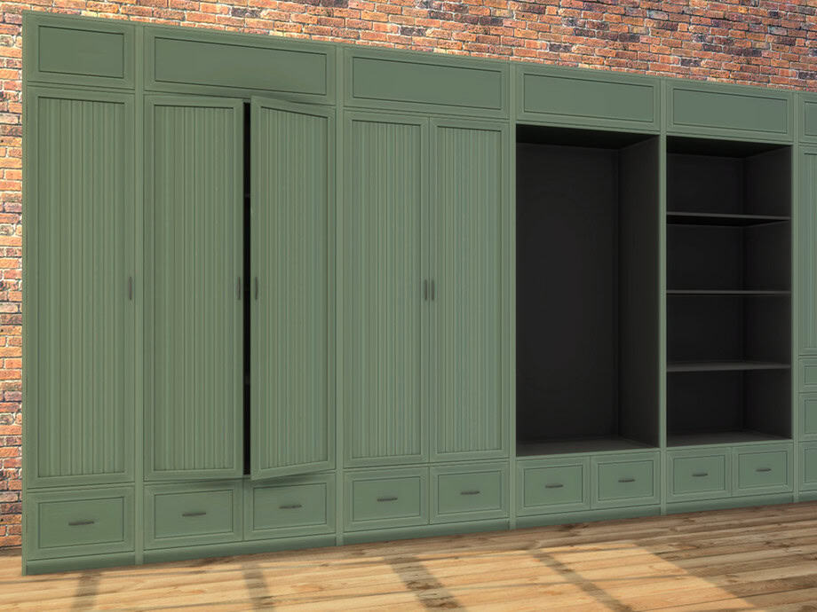 Use this Sims 4 storage cc set to create a cohesive, wall-to-wall wardrobe layout. The mix of closed storage and optional open-shelving sections allows you to keep everyday items hidden while neatly displaying select pieces.