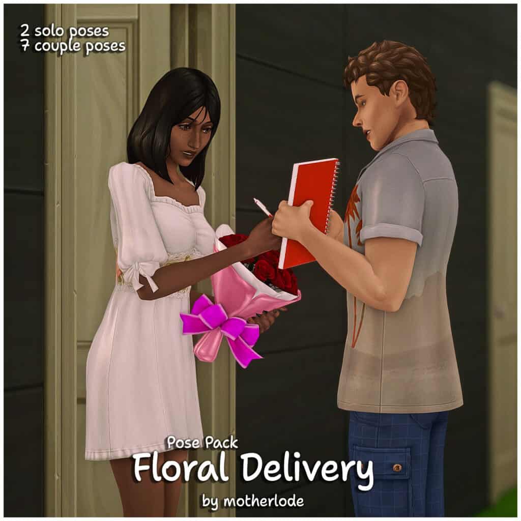 Floral Delivery Pose Pack is a romantic storytelling set that captures the sweetest kind of Valentine’s surprise: flowers arriving right at your Sim’s door. This cc includes 2 solo poses and 7 couple poses, featuring adorable moments. It’s perfect for cozy Love Day screenshots with a realistic “special delivery” theme.