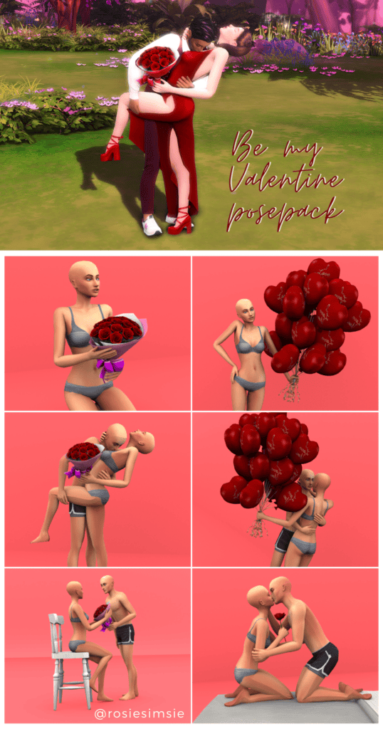 Be My Valentine Pose Pack is a charming Valentine’s Day collection that mixes romantic couple moments with a few sweet solo poses for extra variety. This cc includes 6 poses total, with 2 solo poses and 4 couple poses featuring classic Love Day items like: