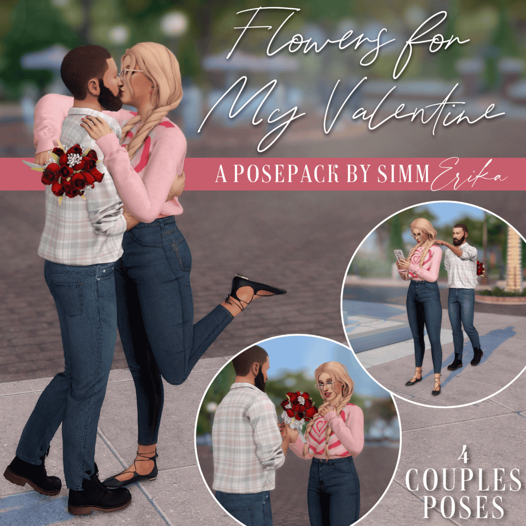 Flowers For My Valentine is the third Valentine’s-themed pose pack by StreamErika. It’s a simple yet sweet pose pack that captures one of the most romantic gestures – a Sim surprising their partner with a bouquet. It’s perfect for soft, everyday romance storytelling screenshots, especially if you want something realistic and heartfelt.